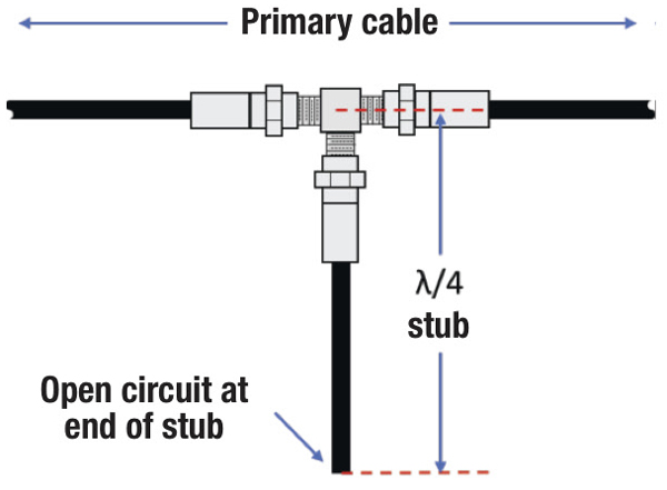 Figure 2. A simple notch filter can be made using an open-circuit electrical quarter wavelength of coaxial cable connected in parallel with the primary cable using a tee.