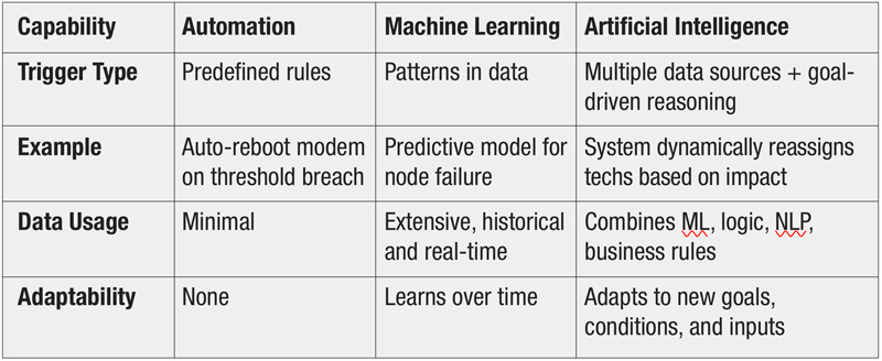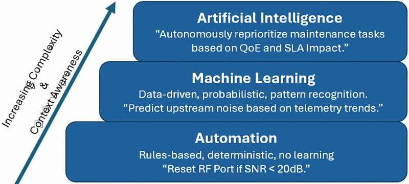Automation, machine learning, and artificial intelligence are not interchangeable terms, they represent a spectrum of complexity and capability. In the context of DOCSIS networks: