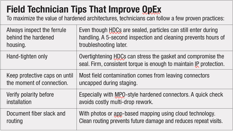 This streamlined approach directly benefits operational efficiency. Faster installations mean more completed jobs per day, reduced dependence on highly skilled splicers, and a workforce that scales more easily with growth. Providers facing aggressive fiber-build timelines, workforce shortages, or rising labor costs can deploy hardened fiber architectures more consistently and efficiently. In many organizations, HDC-based installation strategies have become a major driver of improved OpEx by reducing technician training time, simplifying job workflows, and cutting repeat truck rolls due to environmental failures.